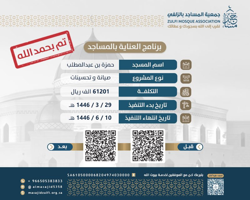 تم بحمد الله وفضله الإنتهاء من مشروع الصيانة و التحسينات لمسجد حمزة بن عبد المطلب