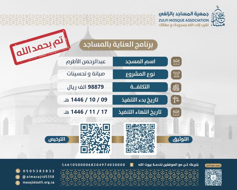 تم بحمد الله وفضله الإنتهاء من مشروع الصيانة و التحسينات لمسجد عبدالرحمن الأطرم